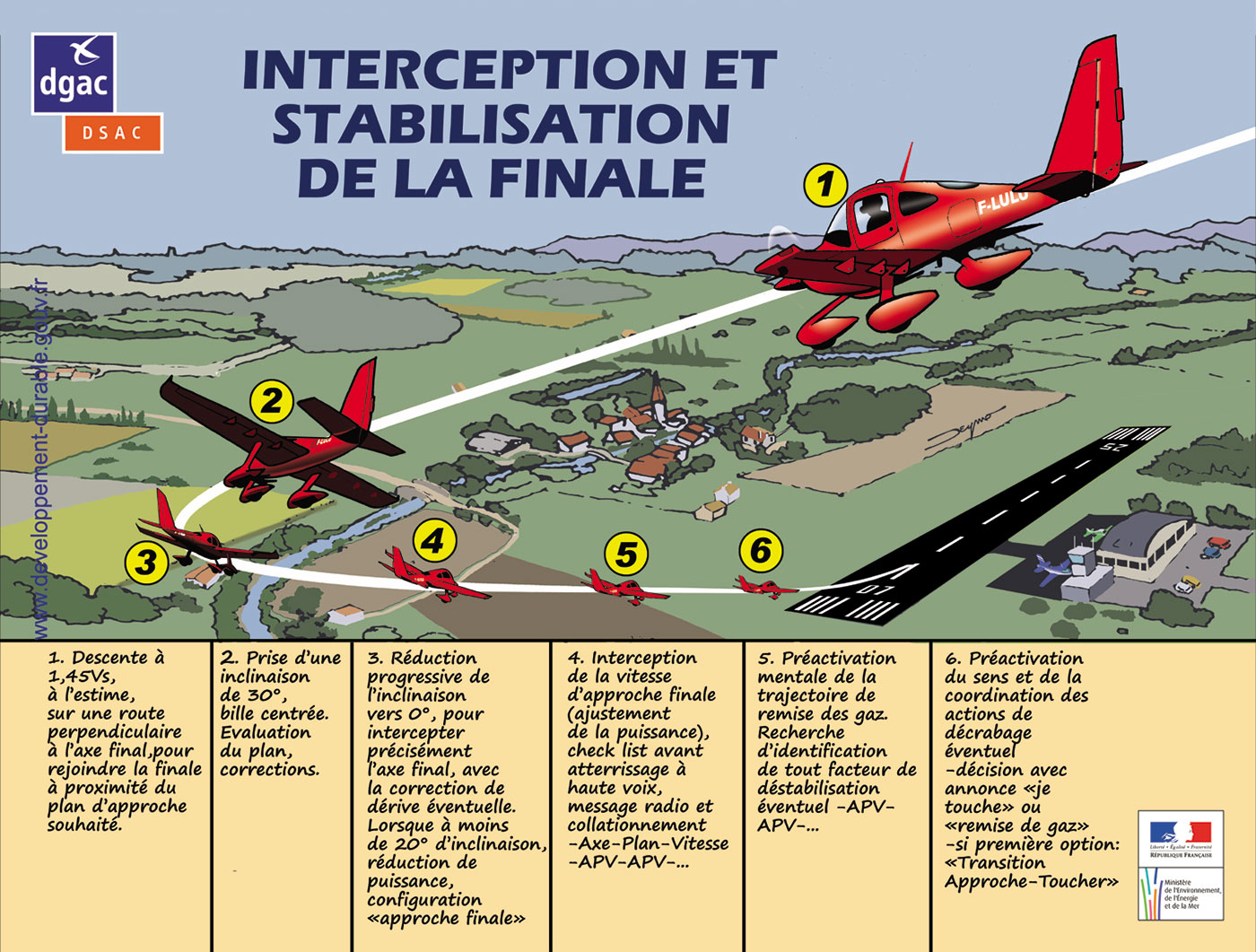 Le pilote a configuré sa machine pour évoluer en approche à 1,45 x Vs, puis dès l’interception en descente de l’axe de piste en configuration atterrissage, à 1,3 x Vs. Les évolutions devront alors être limitées à des inclinaisons de 10° maximum, en configuration atterrissage. Les actions dans l’ordre de leurs priorités sont, interception de la finale, la configuration de la machine pour l’atterrissage, la Check-liste Avant Atterrissage, puis le message radio.