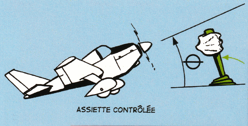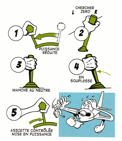 2- Réduction complète de la puissance, inclinaison à 0°, ressource en souplesse vers l’assiette de palier, prise de l’assiette de montée et application de la puissance.