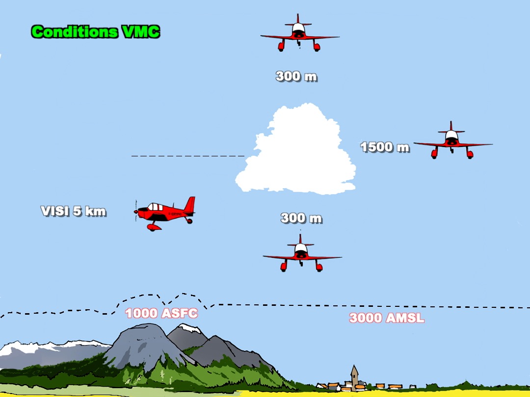 Au dessus d’une altitude de 3000 pieds, ou à une hauteur de plus de 1000 ft au dessus des obstacles si elle est supérieure, les VFR doivent maintenir un espacement de 1500m latéralement et 300m verticalement par rapport aux nuages et une visibilité minimale de 5000m, portée à 8000m au dessus du niveau 100, faute de quoi vous ne seriez plus dans les conditions du vol à vue.