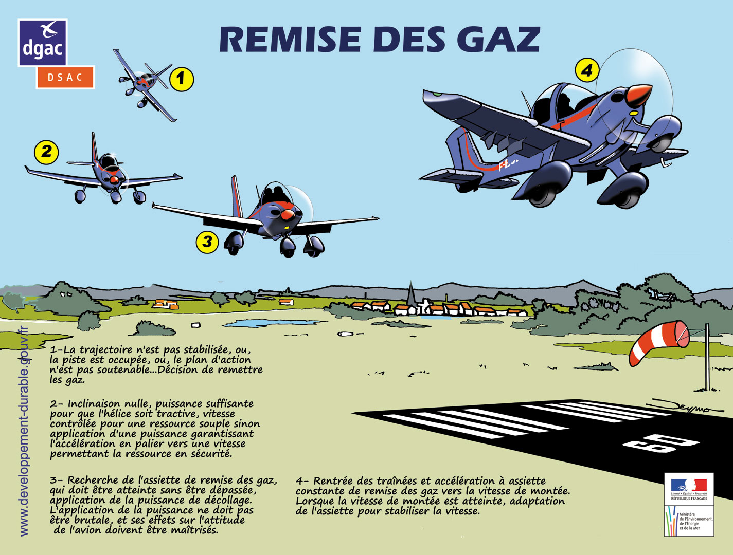 La remise des gaz, débute par l’abandon de l’intention d’atterrir. Certains instructeurs aiment à décrire l’atterrissage comme une remise des gaz manquée, pour exprimer qu’ils prévoient la remise des gaz avant d’envisager l’atterrissage. Lorsqu’une remise des gaz n’a pas été sérieusement envisagée, elle constitue un stress important, et entraine une augmentation brutale de la charge de travail, en particulier en environnement contraint, avec des survols à éviter et des espaces aériens à prendre en compte, ou avec beaucoup de trafic en circuit de piste. Ne pas oublier de faire la Check-Liste Après Décollage, dans l’ordre des priorités.