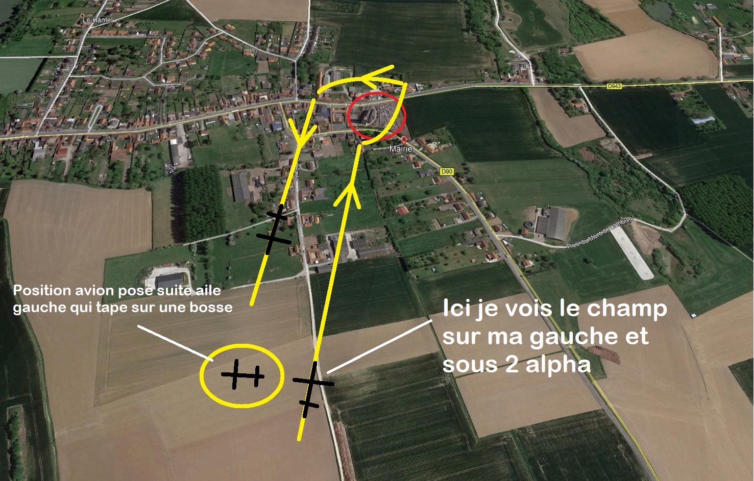 Jean-Luc décide de prendre un excédent de vitesse pour acquérir l’énergie qui lui permettra d’évoluer lorsqu’il sera en vue du sol, un pari qui va s’avérer le bon. Il décide d’un atterrissage train rentré dans le champ labouré. Avant le toucher, il coupe tous les contacts pour réduire le risque d’incendie.